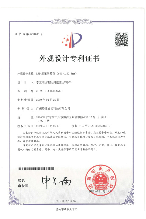 睿視外觀設計專利證書